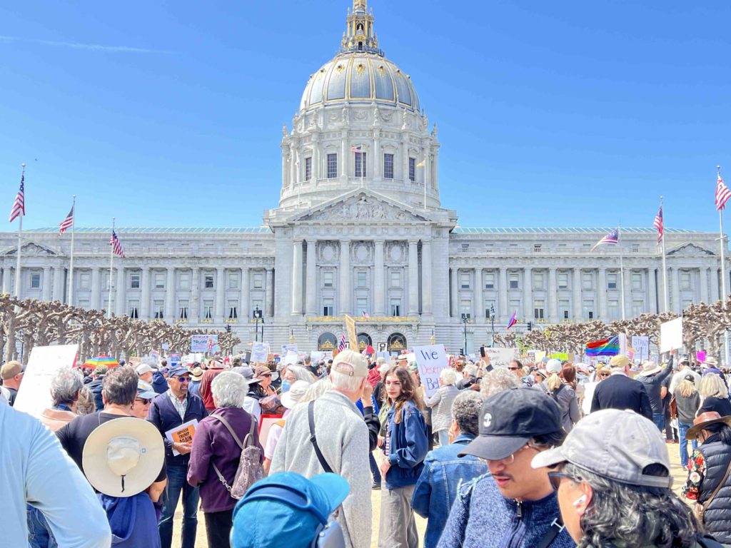 So aside from the whole “Hands Off!” thing, the biggest local anti-Trump and anti-Musk movement has come in the form of weekly protests at various Tesla dealerships around here. (Again, the local version of a larger national movement called “Tesla Takedown.”) In Santa Rosa, the regular Saturday protests outside the Tesla showroom on Airway Drive were drawing around 100 people in February, then a few hundred in March — and they’re now reportedly topping 500 protesters per week. A parallel protest at the Tesla outpost in Sebastopol has been pushing 100 each Saturday, too.