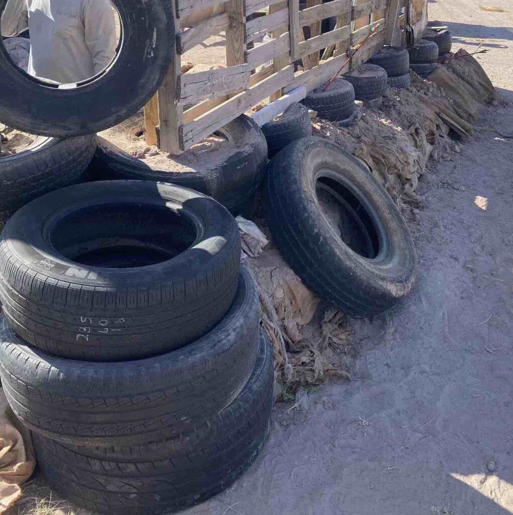 It’s a little over 80 degrees out, and at 6,000 feet in Arizona’s shadeless Painted Desert, the sun blazes down like a nuclear bomb at the white-hot moment of detonation. I’m melting inside my clothes. A slight figure in well-used work garb sits on a tractor ahead of me, slowly churning up the dust. Dozens upon dozens of tires lay all around in the sand. Slowly, the tractor scours out a shallow pit between them, pushing the sand into a pile at one end. I swing into action, piling the tires in tiers around the edge of the pit. Then the tractor begins scooping up sand and dumping it into the tires, filling the columns. I assist the process, shoveling the overflow back into the columns.