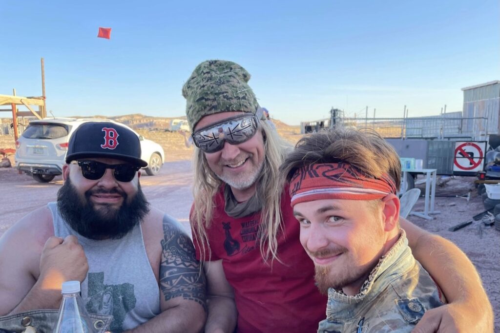 Another neighbor, Annelise Williamson, 49, hails from Santa Fe. After five years, she has yet to acquire a wasteland name. A silversmith for the past 30-plus years, she recently transitioned into costuming in the film industry. She and her partner, Haydn Ford, have attended Detonation for five years. Their tribe, the LZRDF***S, has a wonderfully deep-desert, Western vibe to it. Williamson and I perform a wasteland trade, in which I barter some of my customized leather wasteland pouches for a set of her handmade, film industry-grade metal wasteland “sand” goggles. They are one the highest quality items I have ever owned. Her work is showcased via @annelisewilliamsonmakes on Instagram.