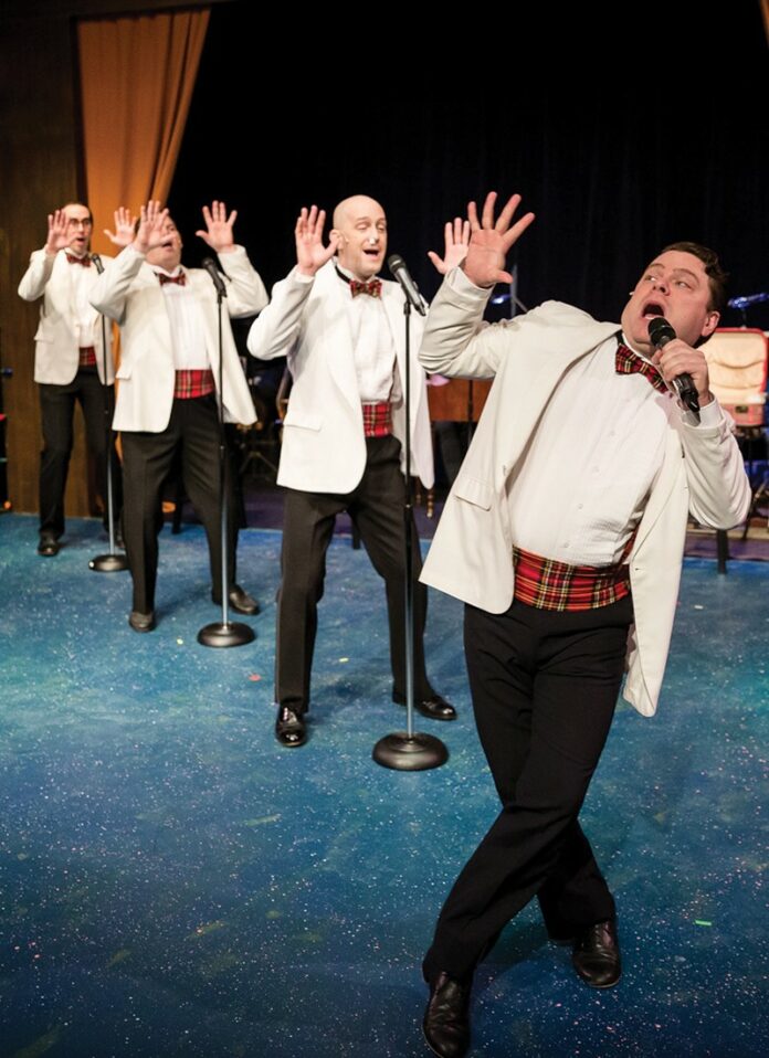 Frankie (F. James Raasch), Sparky (Scottie Woodard), Jinx (Michael Scott Wells) and Smudge (David Murphy) were high school friends who dreamed of musical glory. Following the path created by ’50s versions of what we now refer to as “boy bands” (the Four Lads, the Crew-Cuts, etc.), they formed the Plaids and specialized in four-part harmonies.
