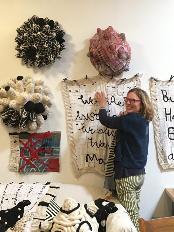 The five featured artists are Frances Arnold, Lori Goldman, Emily Marks, Janet McBeen and Hella Merrill. The artists all work in embroidery, crochet, knitting, twisting and weaving; and they specialize in creating repetitive patterns, applying one material on another and using unusual and unexpected materials.
