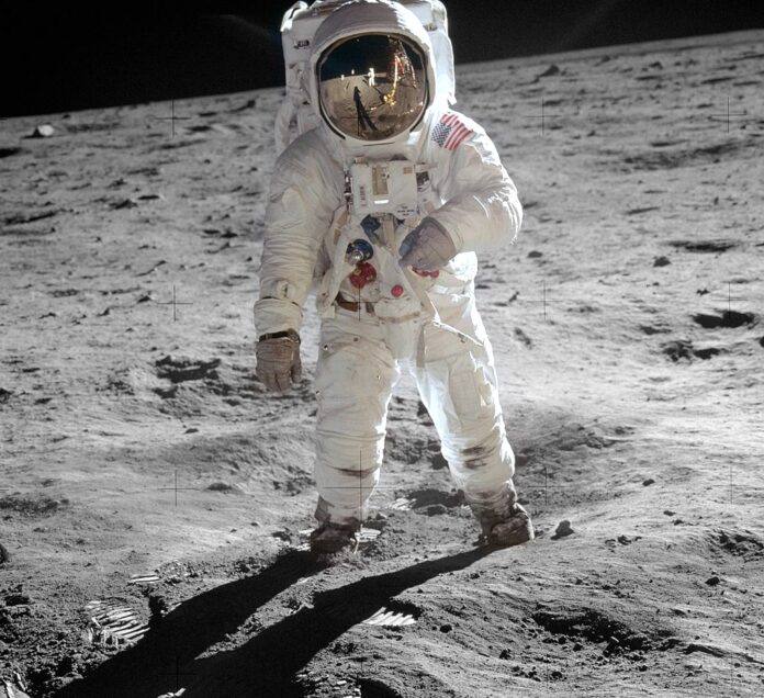 1 VISUAL: We’re looking for two men’s names and one NASA space mission, all of which begin with the same vowel. They were the first two human beings to walk on the moon, on July 20, 1969.