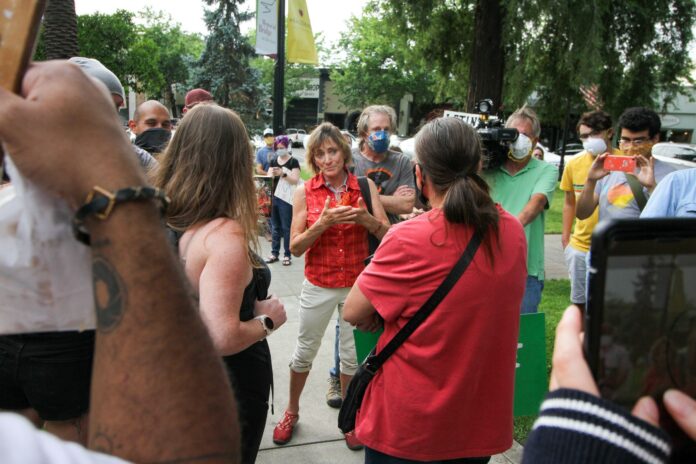 At a June 11 protest in Healdsburg, a crowd of about 250 people gathered by 6:30pm. Chants of “Mayor Gold resign now” reverberated loudly as various Healdsburg residents of color spoke to Gold and the council. Gold said that the people who voted for her were not at the protest and that they still support her.