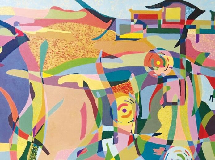 Other works in the exhibit are entirely abstract, with imagined shapes assembled together to create fictional landscapes inspired by the shapes of the Laguna.