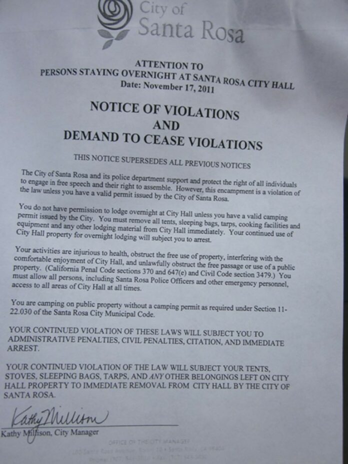 Earlier today, after scuffles over the permitting process at Occupy Santa Rosa came to a head, the Santa Rosa Police Department began issuing eviction notices to unpermitted tents on the lawn of City Hall. Many protestors refused to acquire permits in the first place, citing prohibitive modifications to the original agreement with the City Council after last week’s jubilant but intense meeting.