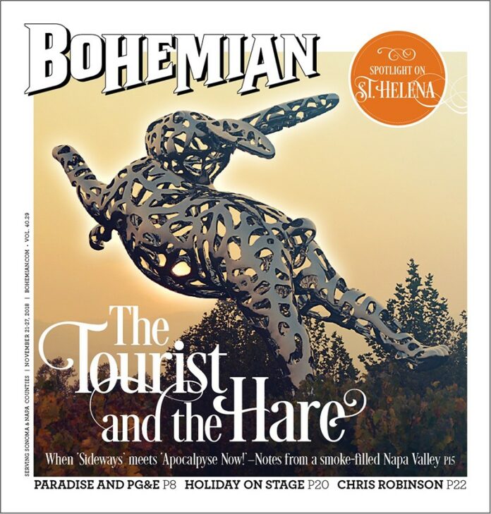 I’m here today window-shopping and checking the commercial hub along Main Street, which centers a town whose boundaries are roughly the massive Beringer Vineyards estate and the Culinary Institute of America at Greystone outpost to the north—and the big shining metal rabbit at Hall Wines to the south, where St. Helena gives way to Rutherford and the epic sprawl of the greater Napa Valley.