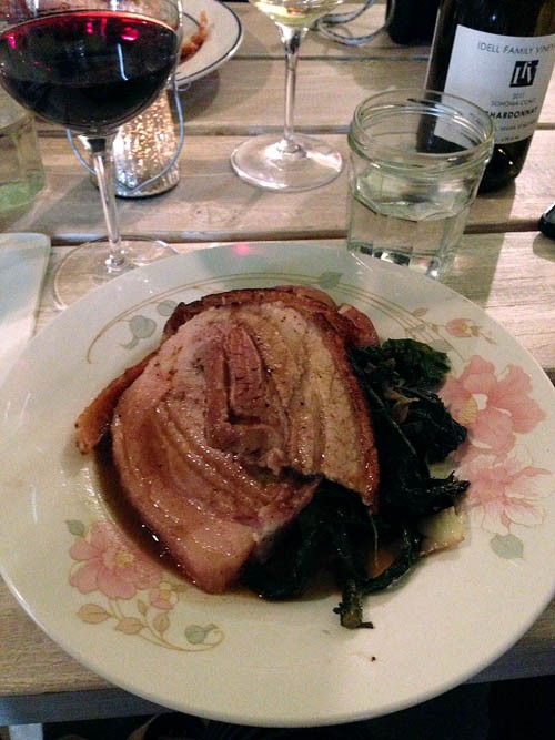 The pork sat atop red buttery red potatoes, cooked whole and cut in half on the plate, as well as a mixture of greens from Bloomfield Farms. The greens were on everyone’s lips during dinner. I wanted to talk about the pork, but no, everyone was so taken with the damn side dish that I didn’t even get to my Porky Pig impression (a dinner party favorite). To be fair, they were really good greens, which Lyle said was just a simple mix of kale, spinach and chard. Again, he doesn’t do much to them here, but the mixture of flavors took away from the natural bitterness that usually turns me away from greens, especially kale. Yeah, I said it. Kale sucks. But this kale, mixed with other goodies, didn’t suck. Maybe I’m beginning to see the light. Maybe I was just high on pig juice. (Wouldn’t be the first time).