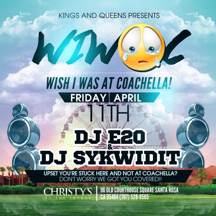 But don’t trip on being broke and stuck at home. The first ever Wish I Was At Coachella party is happening tonight at Christy’s in downtown Santa Rosa, where homegrown boys DJs Sykwidit and E20 are going to spin everything under the hot desert sun, from Outkast and Skrillex to Chvrches and Little Dragon. Come get your dance on and don’t be like these guys. The North Bay’s baddest party DJs are gonna rock all the real bands you are gonna miss because you couldn’t decide what to wear.