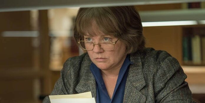 The literally catty tragicomedy Can You Ever Forgive Me? commences nicely with Melissa McCarthy playing Lee Israel, surly, shabby and frumpy at a publisher’s office—meeting a deadline at 3am with the help of a big glass of something on the rocks. She’s fired for drinking on the job, even at that hour. As she leaves, a younger employee mutters, “If I ever get like that, kill me.” Israel snaps back: “If you ask me nicely, I’ll kill you now.”