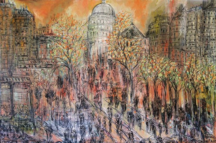 Quickly taking to the canvas, Fanucci discovered a talent for composing abstract cityscapes, depicting international locations like Paris and Washington, D.C. (pictured), with densely layered images of skyscrapers, urban parks and crowds of people that blur together with a dreamlike perspective.